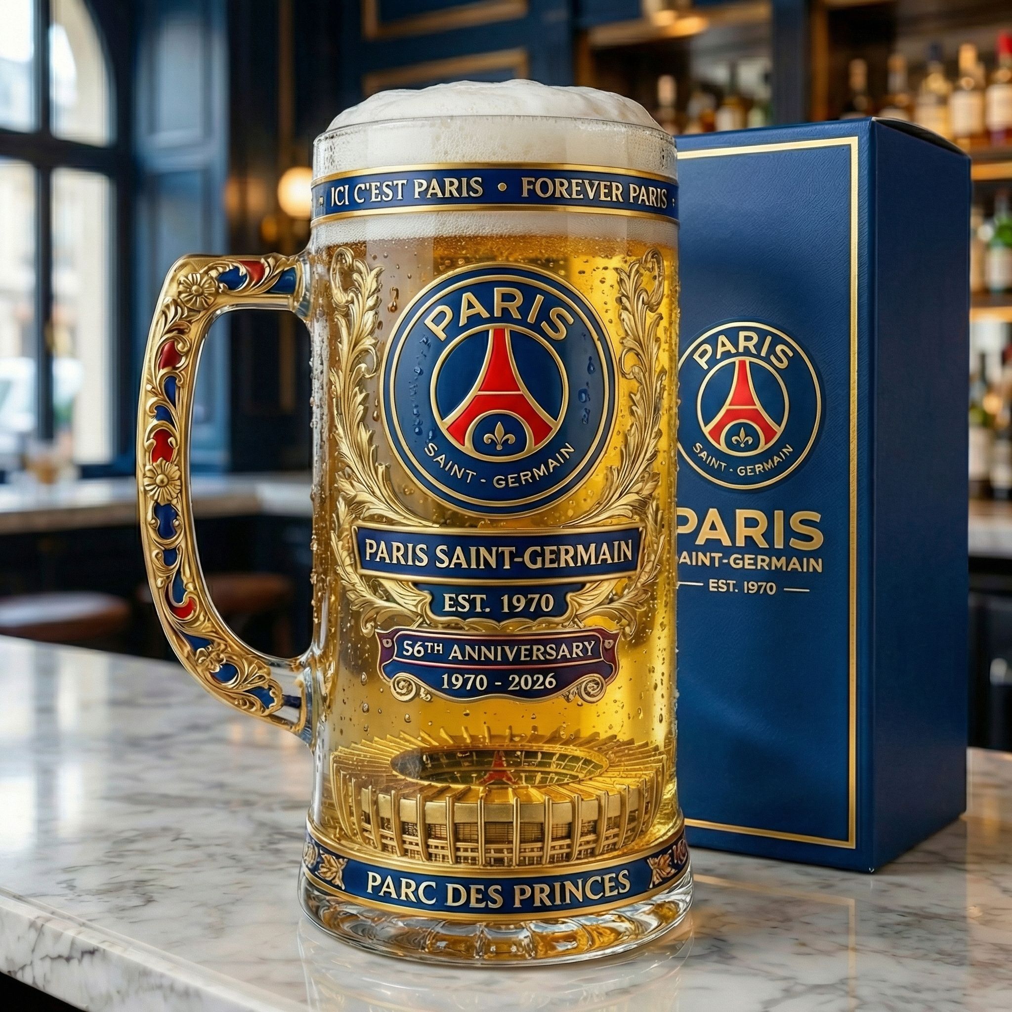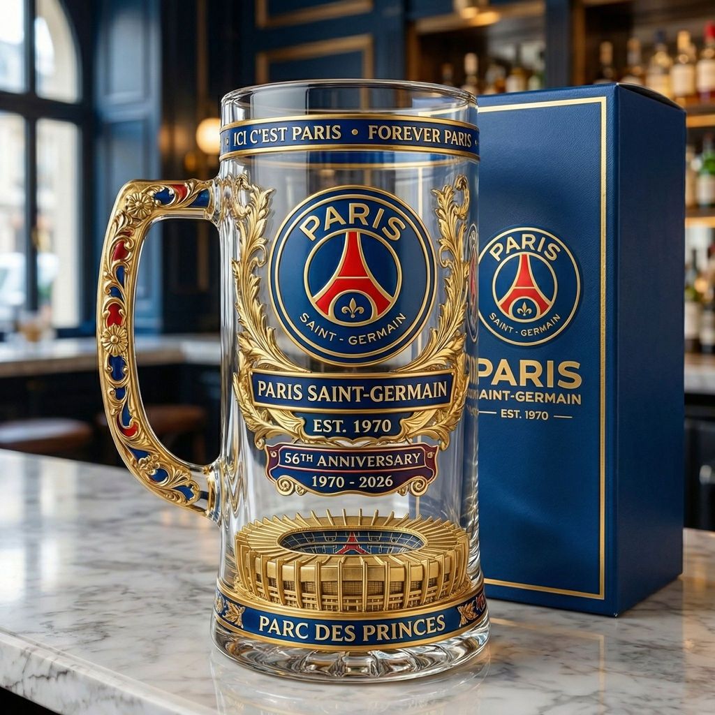 Feiern Sie 56 Jahre Paris Saint-Germain (1970-2026) mit diesem außer gewöhnlichen, limitierten Biers tein. Dieses Sammlerstück mit komplizierten Gold details und dem ikonischen PSG-Branding ist eine Hommage an einen der renommiertes ten Fußball vereine Frankreichs.