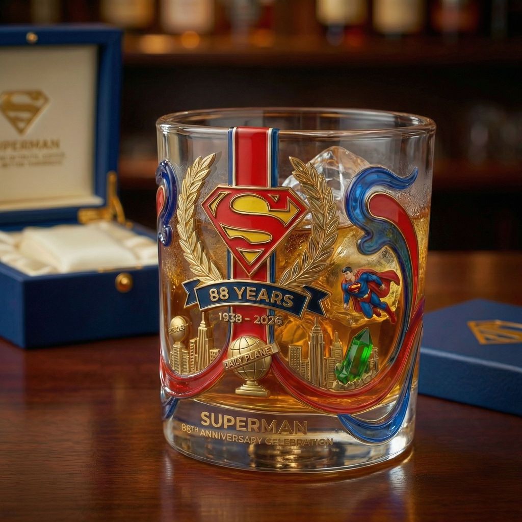 🦸♂�� Feiern Sie 88 Jahre Wahrheit, Gerechtigkeit und Heldentum mit diesem Whisky glas zum Superman-Jubiläum und ehren Sie das Erbe von 1938 bis 2026. Mit dem ikonischen S-Schild, dem fließenden rot-blauen Design und strahlenden goldenen Akzenten fängt es die Stärke und Hoffnung des größten Helden der Welt in jedem Detail ein.