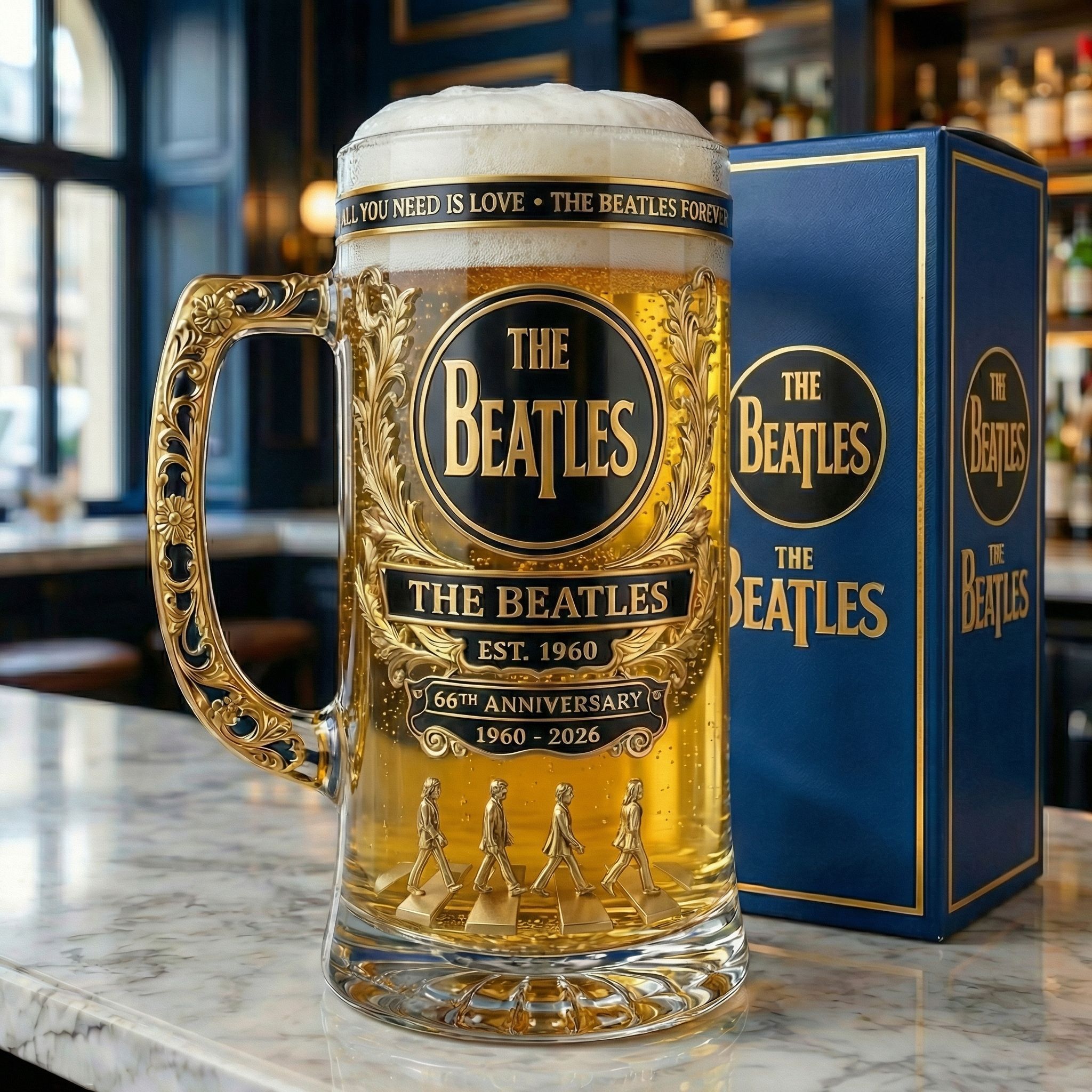 Der Bierkrug enthält das ikonische Logo der Beatles und den klassischen Text "All You Need Is Love". Die Worte "66. ANNIVERSARY" sind in der Mitte eingraviert, und auf der Basis befindet sich eine detaillierte Figur mit der Abbey Road, einer direkten Hommage an eines der berühmtesten und beliebtesten Albumcover der Beatles.