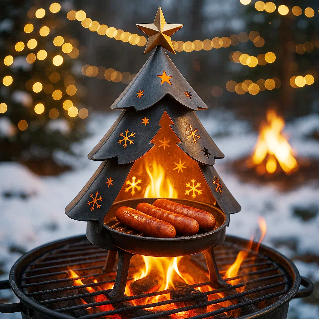 🎄 Der Weihnachtsbaum-Grillständer ist von der Romantik der Weihnachtszeit inspiriert. Seine geschichtete Baumform und die zarten Schneeflocken-Ausschnitte schimmern im Schein des Feuers und schaffen eine zauberhafte Weihnachtsnachtszene, die einem Wintertraum entsprungen scheint.