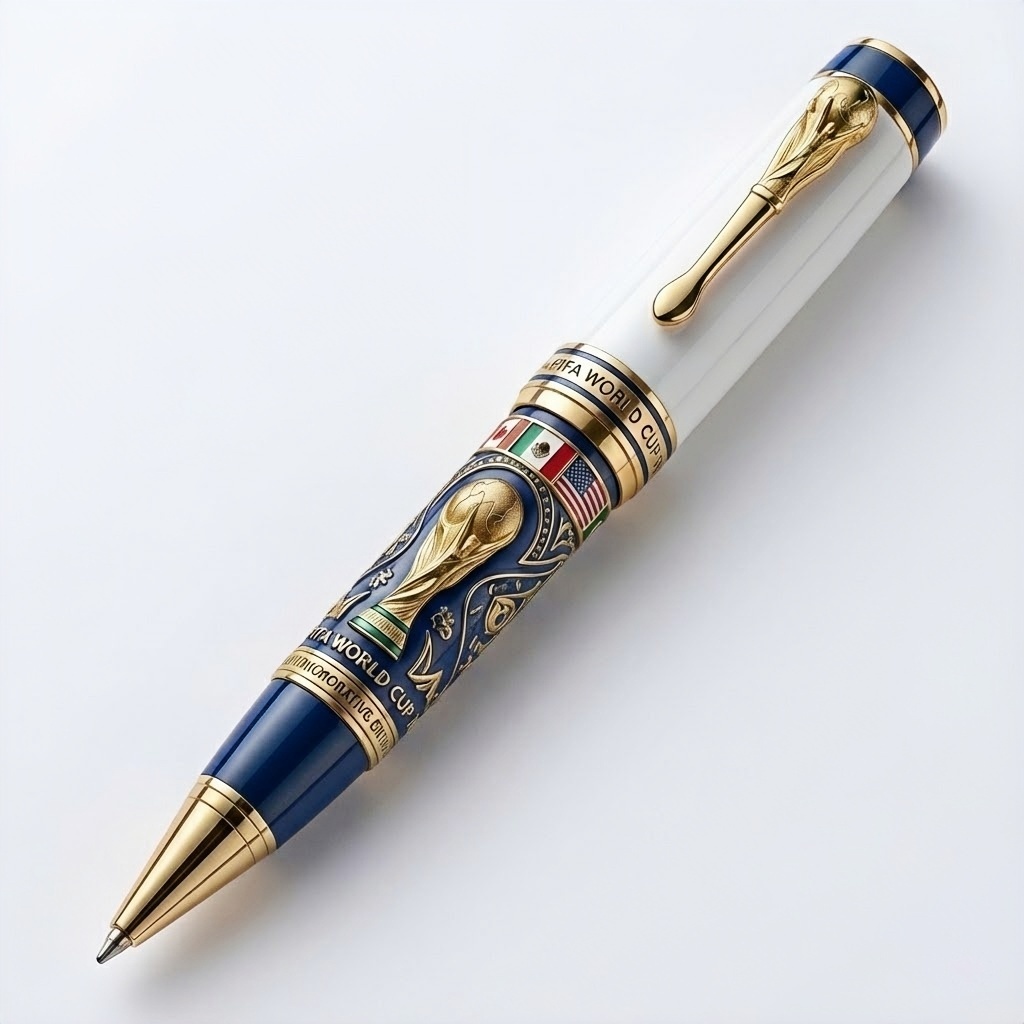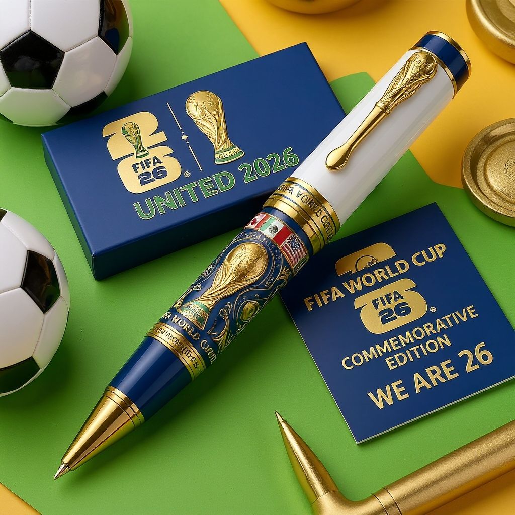 ✨Der Stift trägt ein raffiniertes weißes und tief marineblaues Fass aus Porzellan mit schimmernden goldenen Akzenten und verfügt über ein atember aub endes, hochrelief-Gold-Radierung mit der legendären FIFA WM-Trophäe neben den lebhaften Flaggen der Gastgeber länder-Kanada, Mexiko, und die Vereinigten Staaten-die Seele der Vision "United 2026" einfangen.