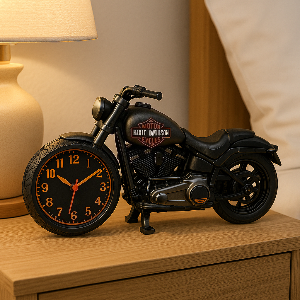 ⚙️ Mit einem mattschwarzen Gehäuse, einem detailreichen Motor und einem Zifferblatt am Vorderrad fängt es den Bikergeist in jedem Detail ein. Stellen Sie es auf Ihren Nachttisch oder Schreibtisch und setzen Sie damit ein starkes Statement.